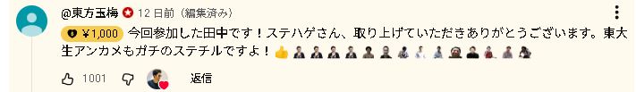 チキンスティック田中さんは、ステハゲさんのチャンネル内で、「本人です」と反応しています。
